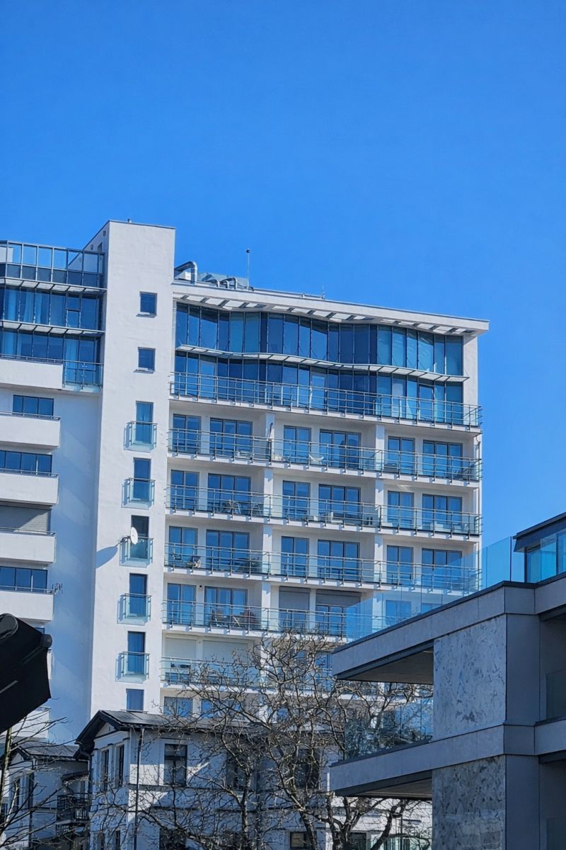 Balkon usytuowany jest z bocznej strony budynku, co zapewnia osłonę przed wiatrem, przy jednoczesnym zachowaniu pełnego widoku na morze oraz panoramę miasta. Układ ten umożliwia komfortowe korzystanie z przestrzeni zewnętrznej przez większą część roku.