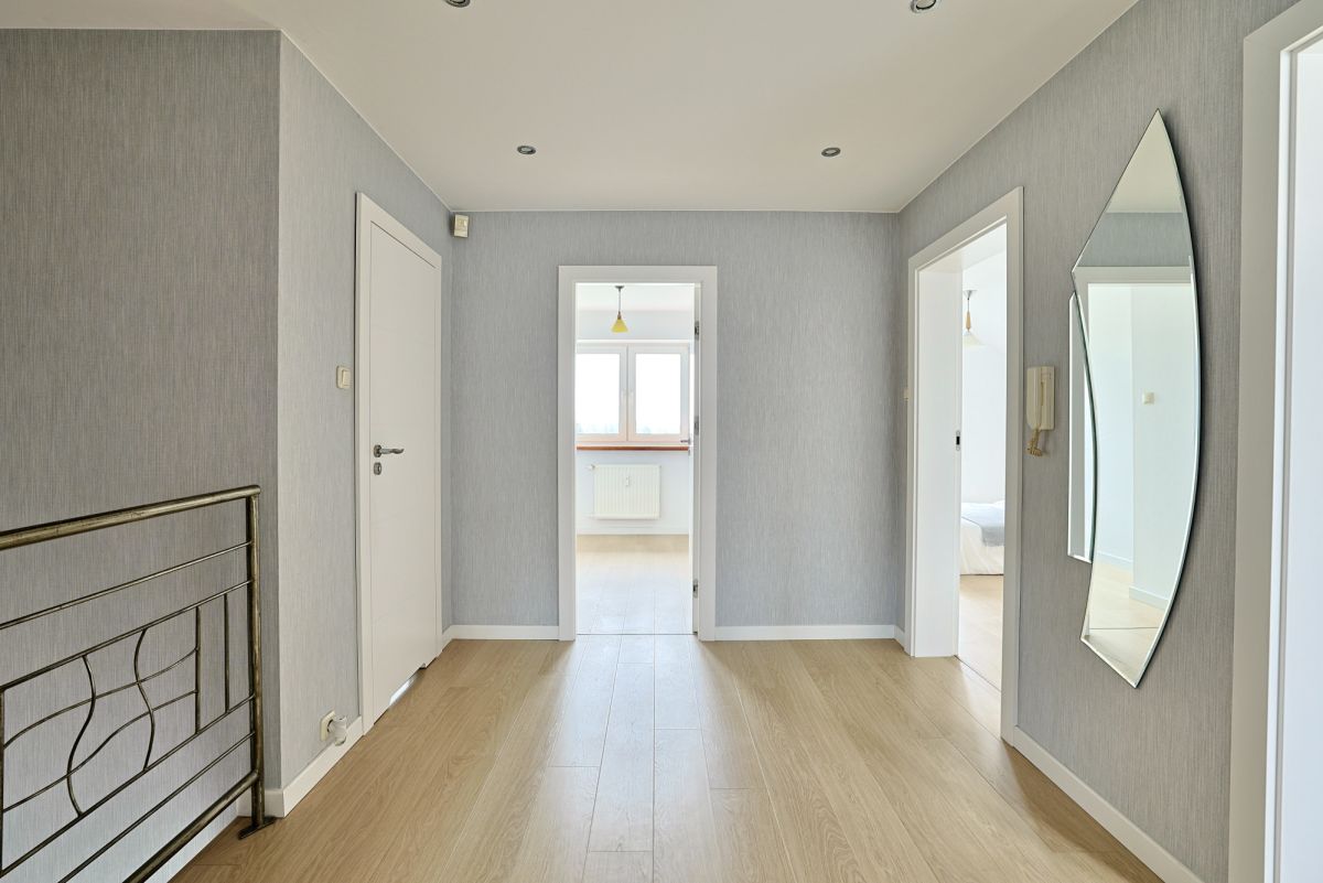 Poziom II : - Sypialnia z garderobą - 2 dodatkowe sypialnie - Pokój biurowy - Łazienka z wanną Standard i wyposażenie: - Kuchnia w zabudowie na wymiar z pełnym AGD: lodówka, płyta indukcyjna, piekarnik, wielofunkcyjna zmywarka, okap - Klimatyzacja w każdym pokoju, kuchni i jadalni - Ogrzewanie centralne + podłogowe (poziom dolny)