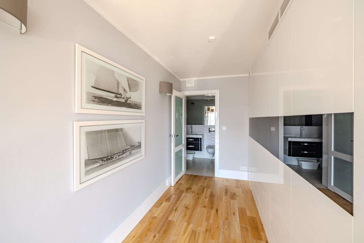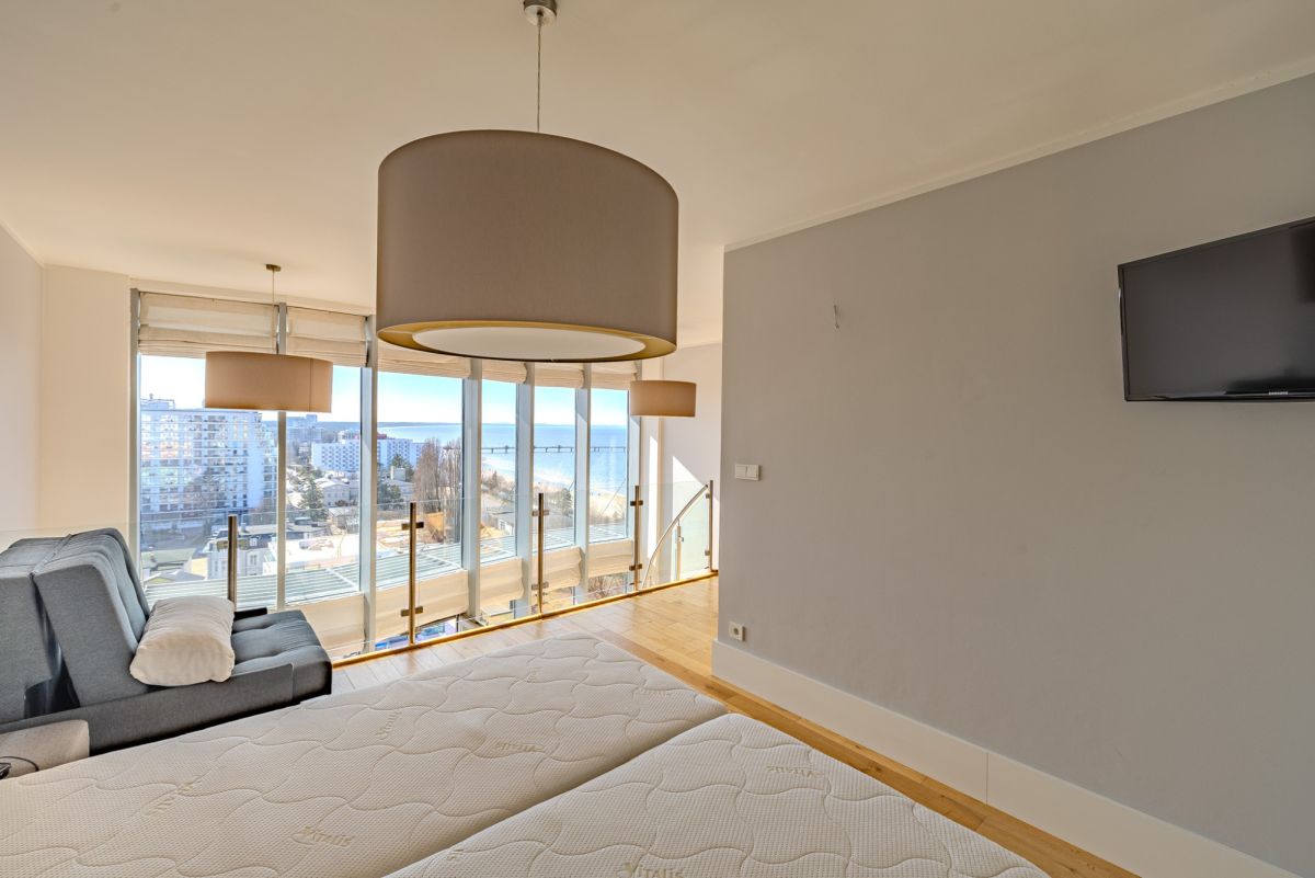 Dzięki ekspozycji oraz panoramicznym przeszkleniom, z sypialni można podziwiać spektakularne zachody słońca nad morzem bez konieczności wstawania z łóżka.