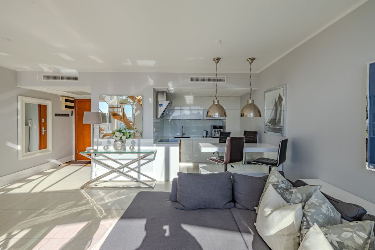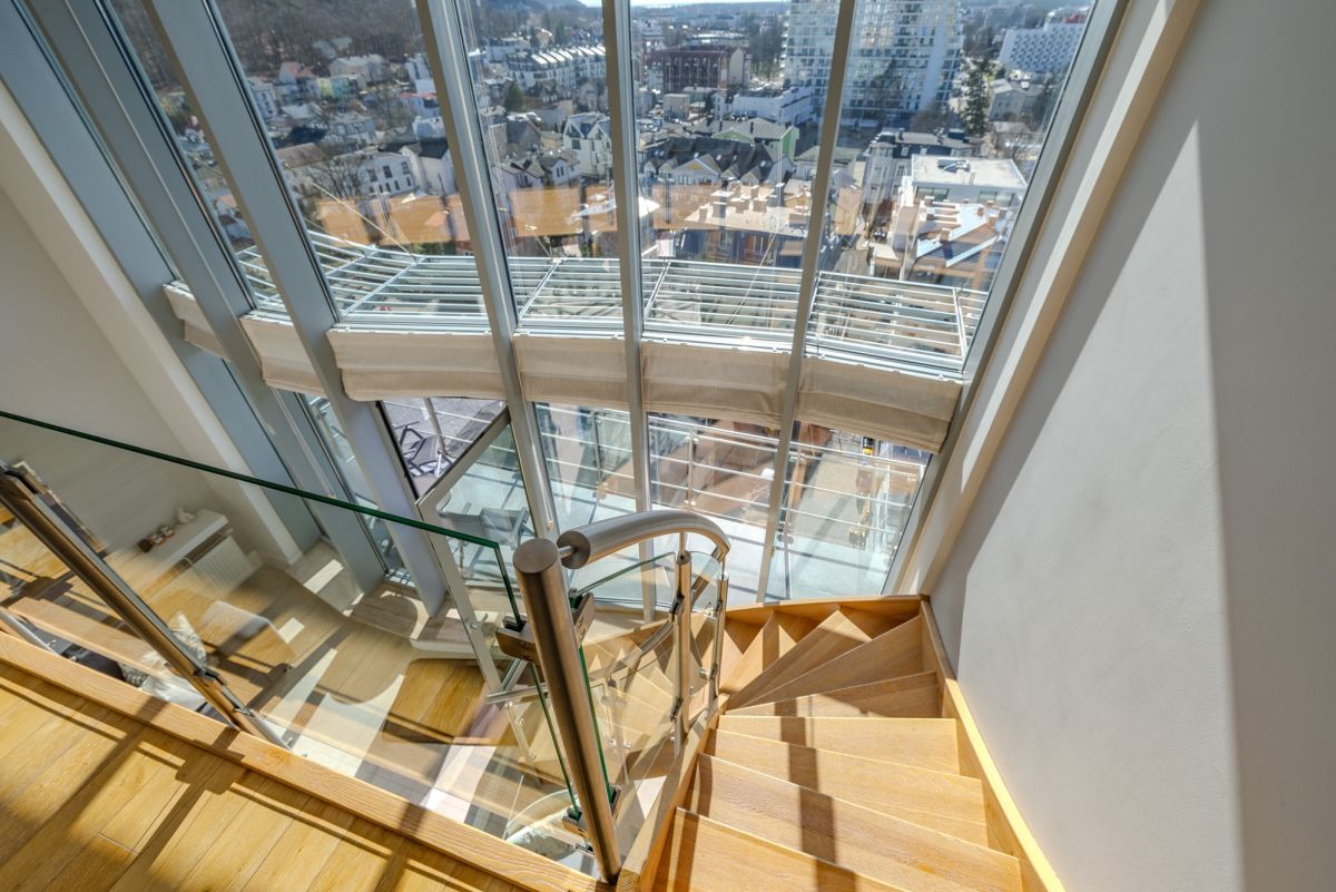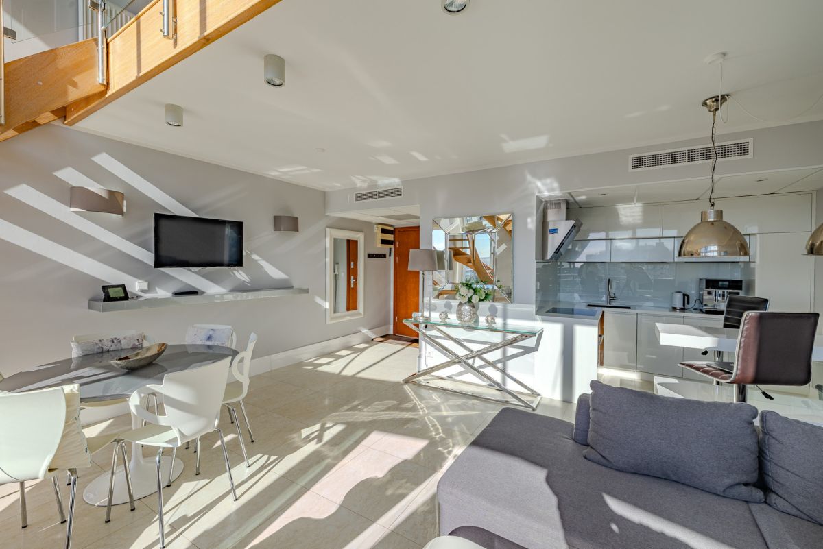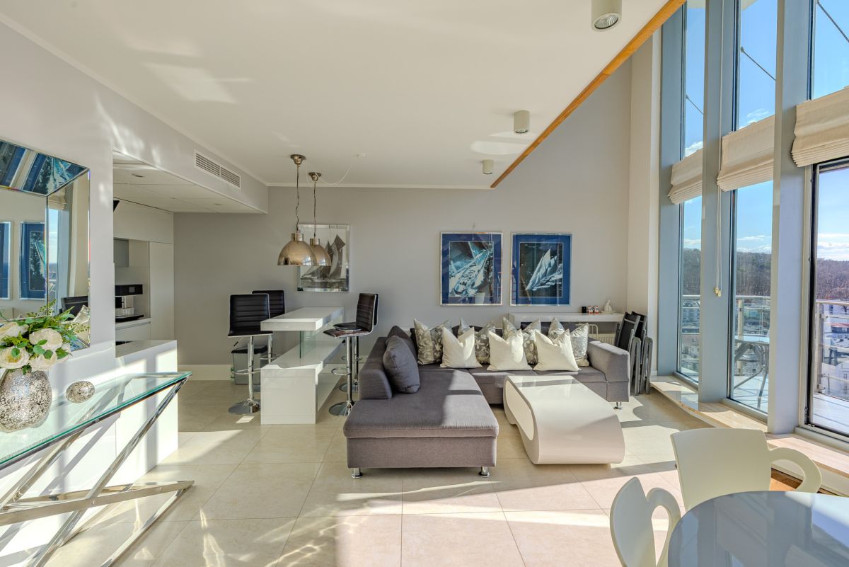 Apartament został zaprojektowany jako przestrzeń dwupoziomowa, co w połączeniu z wysokością sięgającą około 5,8 m zapewnia wyjątkowe poczucie przestrzeni i doskonałe doświetlenie wnętrza.