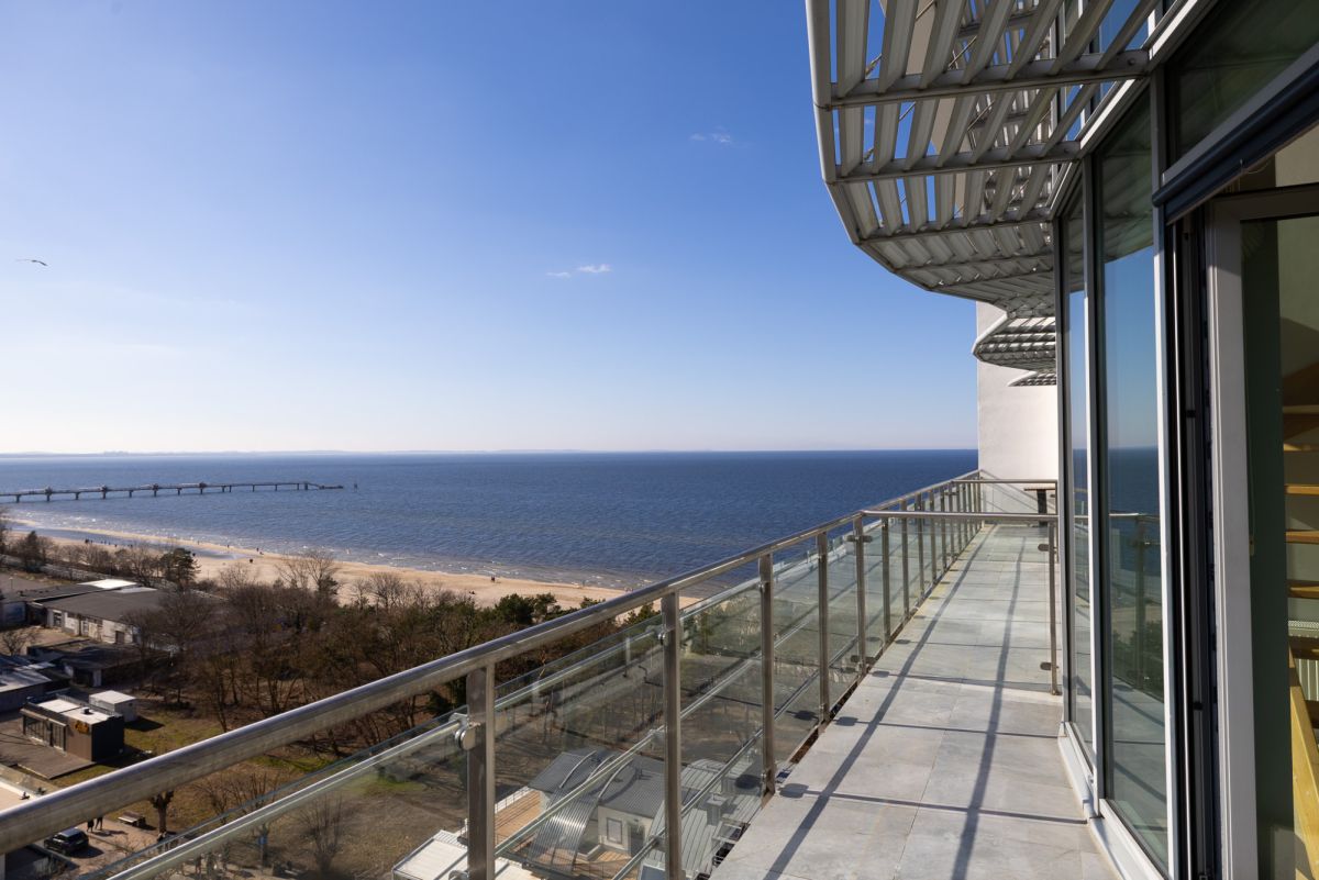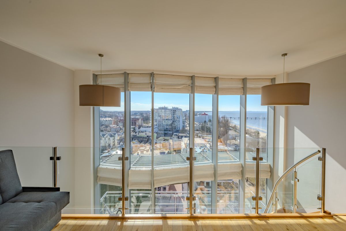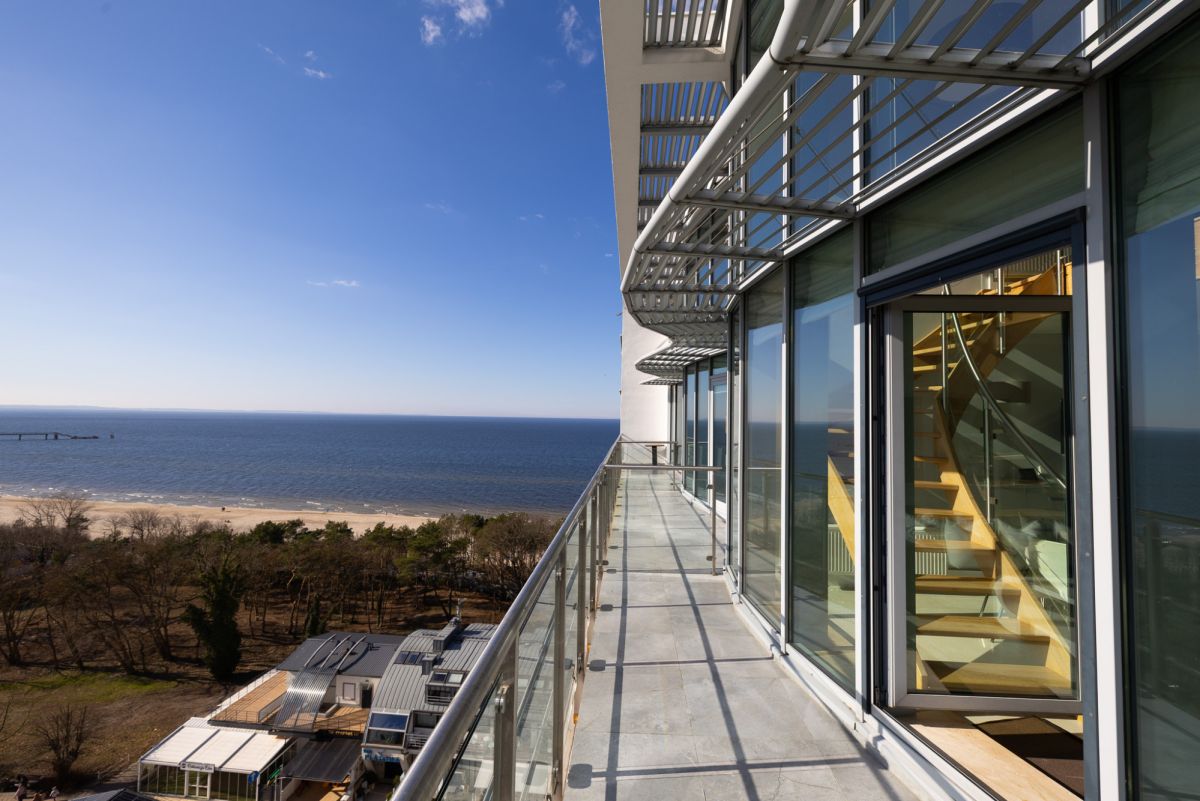 Balkon usytuowany jest z bocznej strony budynku, co zapewnia osłonę przed wiatrem, przy jednoczesnym zachowaniu pełnego widoku na morze oraz panoramę miasta. Układ ten umożliwia komfortowe korzystanie z przestrzeni zewnętrznej przez większą część roku.