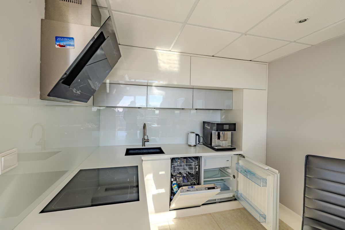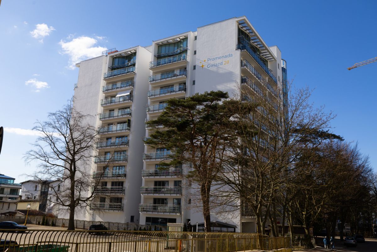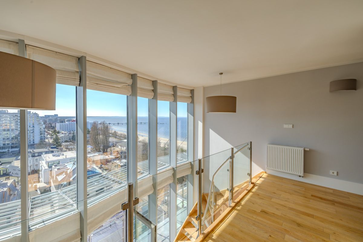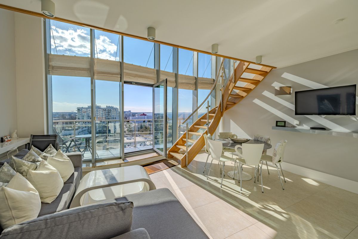 Balkon usytuowany jest z bocznej strony budynku, co zapewnia osłonę przed wiatrem, przy jednoczesnym zachowaniu pełnego widoku na morze oraz panoramę miasta. Układ ten umożliwia komfortowe korzystanie z przestrzeni zewnętrznej przez większą część roku.
