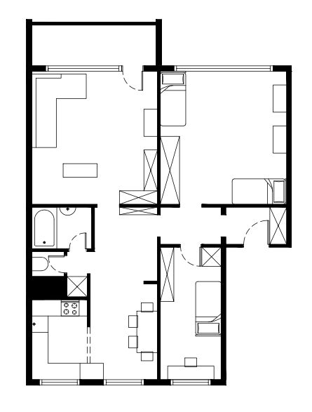 Dodatkowe pokoje (+2)1. Duża sypialnia może być podzielona na dwie sypialnie po 10-11 m2 (podział poprzez wstawienie ściany działowej i wykonanie drzwi z korytarza w ścianie działowej)