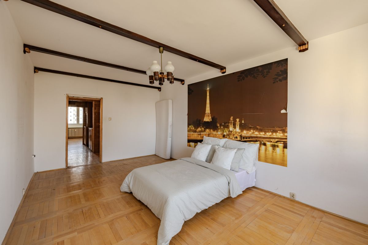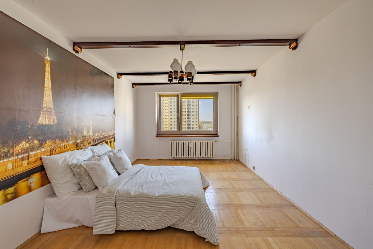 MIESZKANIE Położone jest na 7. piętrze w bloku zbudowanym w latach 80tych. Składa się z dużego salonu wielkości kawalerki (z wyjściem na zachodni balkon), ogromnej sypialni tej samej wielkości, drugiej sypialni, kuchni, jadalni, toalety z prysznicem i oddzielnego WC.