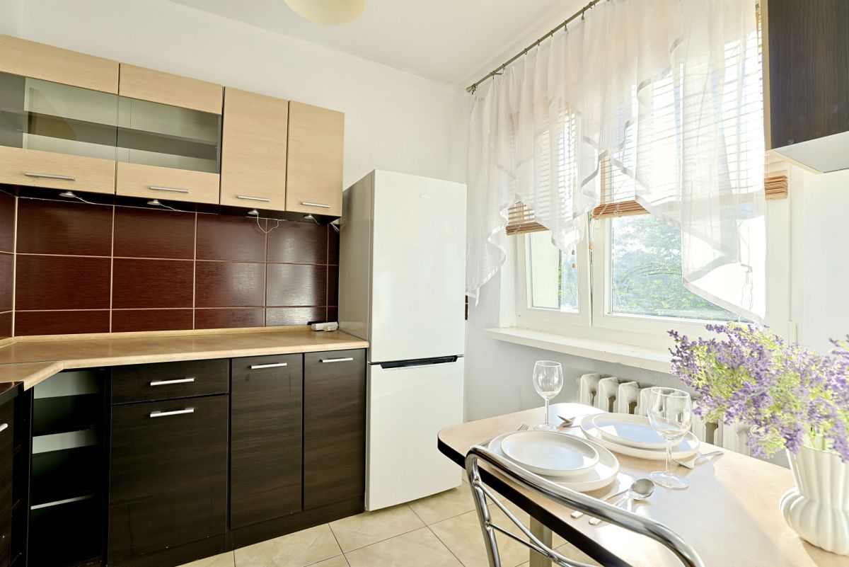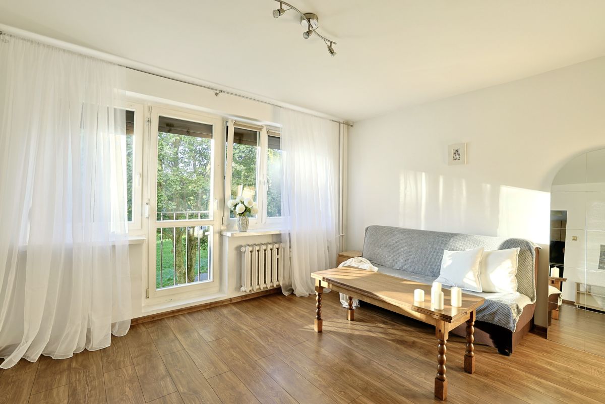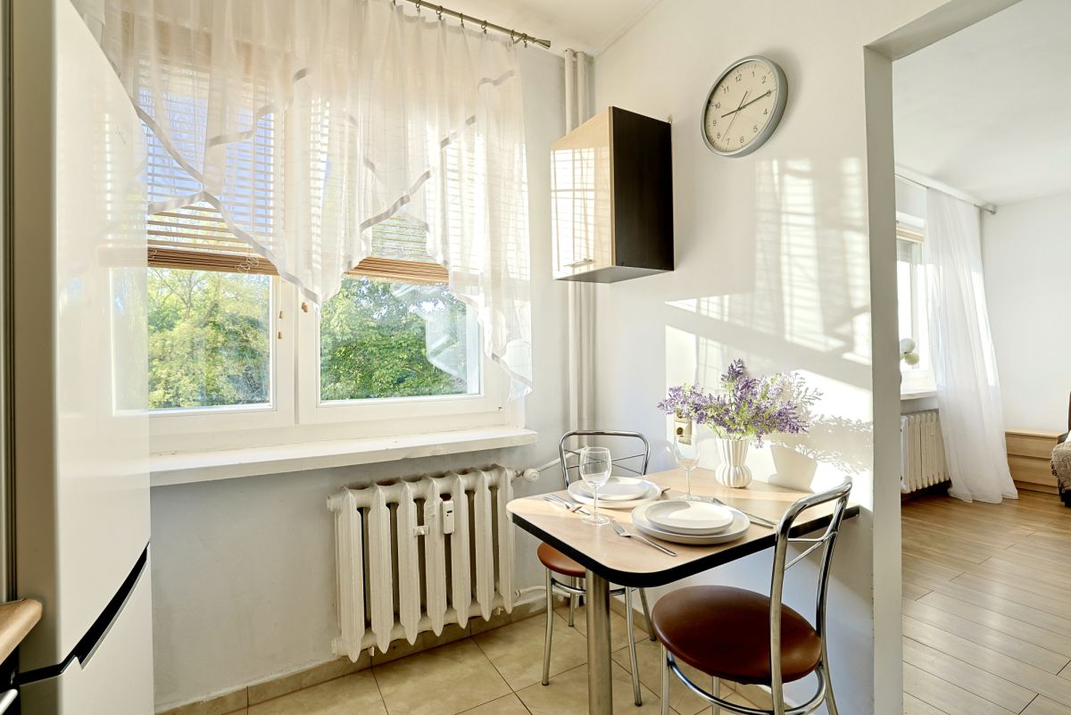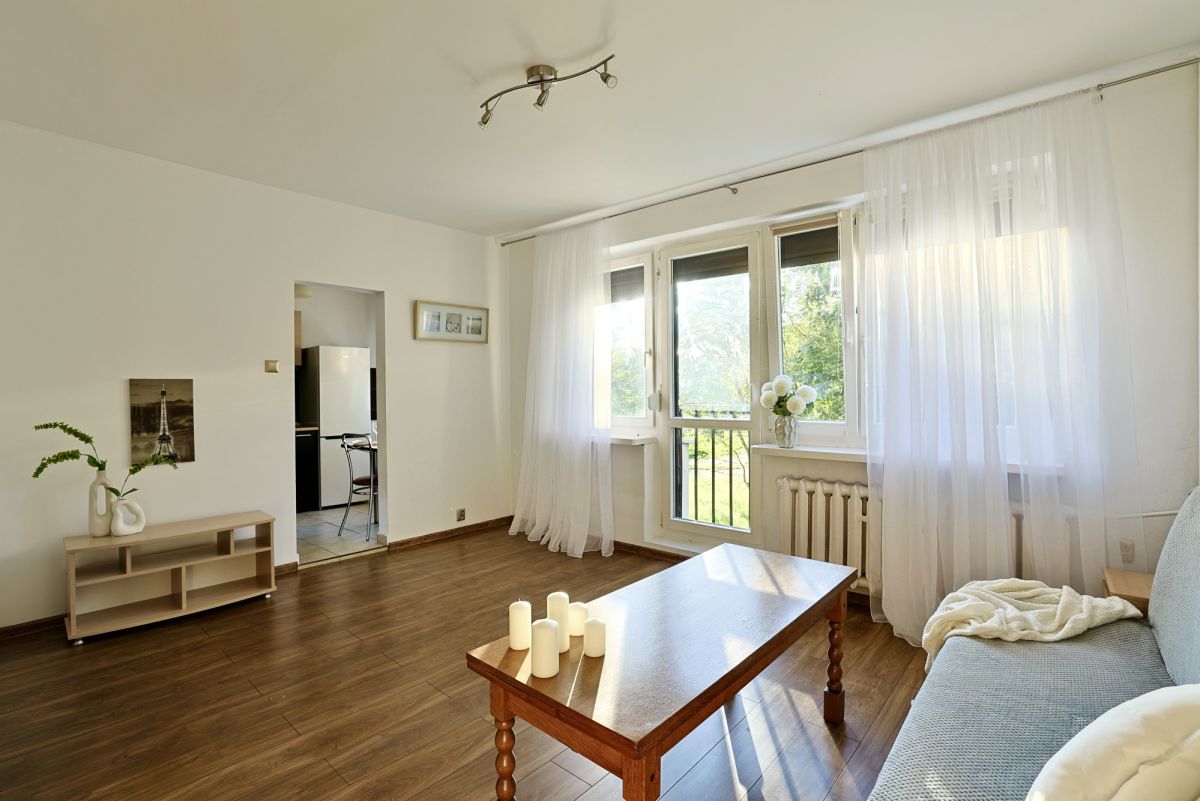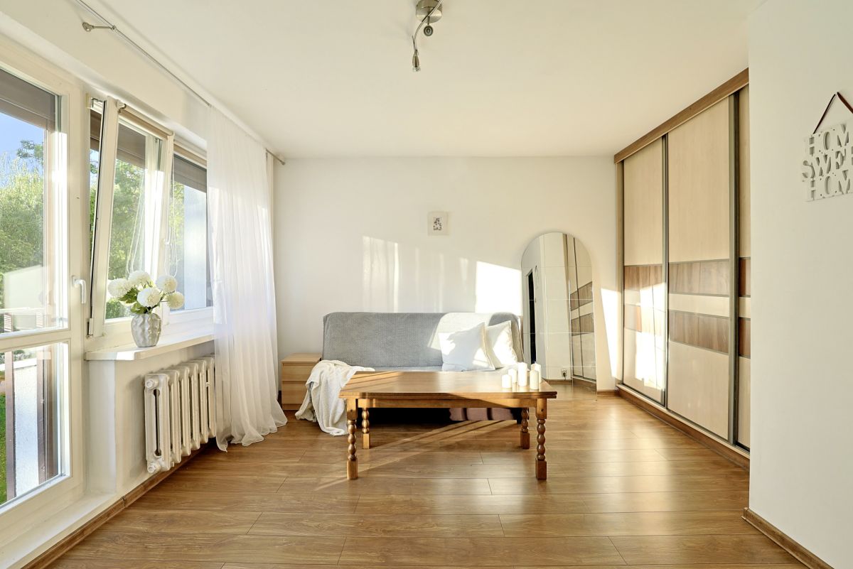 Jasne, ciche mieszkanie z zachodnią ekspozycją i widokiem na zieleń. Położone poza ścisłym centrum, na 1. piętrze 11-piętrowego bloku z windą (rok budowy 1978). Bardzo dobry stan techniczny, częściowo umeblowane.